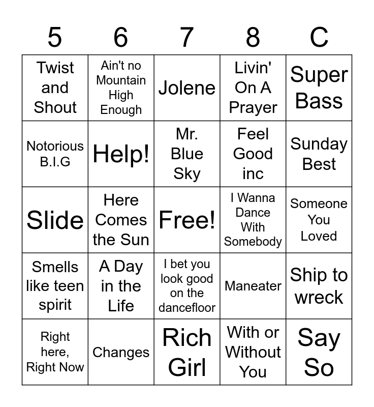 This bingo card has a free space and 74 words: Put your head on my shoulder, Immigrant Song, Mr. Blue Sky, 9 to 5, You shook me all night long, Baba O'Riley, Can't Help Falling in Love, Champagne Supernova, Wake me up Before yo go-go, Blinding Lights, Right here, Right Now, Song 2, Feel Good inc, Super Bass, Tiny Dancer, Changes, YMCA, I Wanna Dance With Somebody, Day 'N' Nite, Twist and Shout, Here Comes the Sun, Jolene, Livin' On A Prayer, Someone You Loved, Notorious B.I.G, Unchained Melody, (They Long To Be) Close To You, Another One Bites the Dust, bad guy, Ms. Jackson, Help!, Dreams, The Real Slim Shady, Adore You, Hotline Bling, Gold Digger, Get lucky, Dont Stop Believing, Say So, Crazy in love, Stand By Me, I bet you look good on the dancefloor, Like a Prayer, Don't Start Now, Come Fly With Me, Ain't no Mountain High Enough, So Far Away, Everybody wants To Rule The World, Rain on Me, Fluorescent Adolescent, Ring of Fire, Fire and Rain, Maneater, Cardigan, I Walk The Line, Fortunate Son, Rich Girl, Total Eclipse of the Heart, Blue Monday, Smells like teen spirit, A Day in the Life, Your Song, With or Without You, Ship to wreck, Slide, Can't stop, Stayin'Alive, Love Shack, Sunday Best, Californication, Seven nation army, My Sweet Lord, Sweet Dreams and Perfect Day.