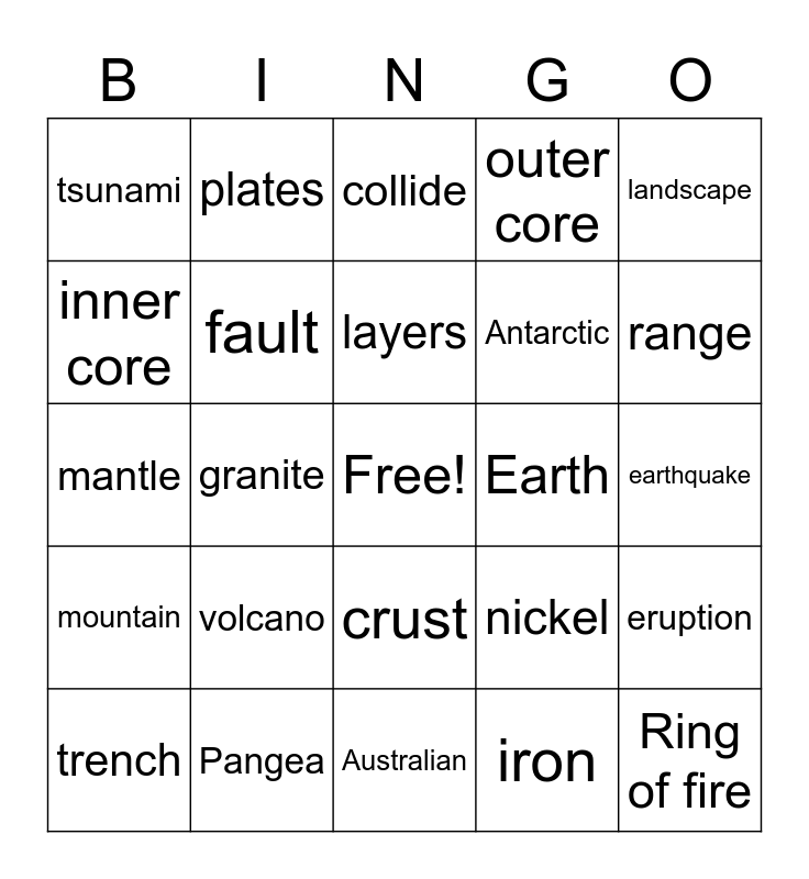 This bingo card has a free space and 24 words: volcano, Pangea, layers, trench, landscape, tsunami, inner core, plates, Earth, crust, Antarctic, mantle, nickel, eruption, fault, iron, earthquake, collide, range, granite, Ring of fire, mountain, outer core and Australian.