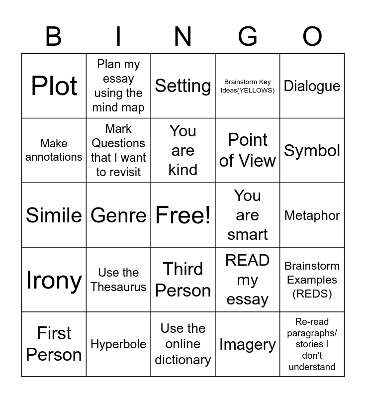This bingo card has a free space and 46 words: Highlight important words, Re-read paragraphs/ stories I don't understand, Eliminate answer choices, Use the online dictionary, Use the Thesaurus, Take my time, Plan my essay using the mind map, Color code answer choices on revising, Make annotations, Preview the questions, Mark Questions that I want to revisit, Brainstorm Key Ideas(YELLOWS), Brainstorm Examples (REDS), READ my essay, Read the instructions for each section, You are amazing, You are kind, You are smart, Characterization, Dialogue, Genre, Imagery, Plot, Point of View, Style, Symbol, First Person, Second Person, Third Person, Irony, Personification, Alliteration, Diction, Allegory, Allusion, Hyperbole, Metaphor, Figurative Language, Foreshadowing, Anecdote, Repetition, Setting, Simile, Theme, Tone and Mood.