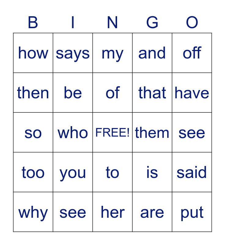 This bingo card has a free space and 29 words: why, all, who, move, how, my, be, you, them, see, see, put, her, are, have, so, to, too, off, so, is, has, that, then, and, says, said, of and they.