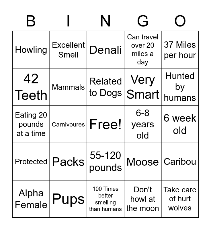 This bingo card has a free space and 24 words: Packs, Pups, Related to Dogs, Alpha Female, 37 Miles per hour, Howling, 42 Teeth, Excellent Smell, 6-8 years old, 55-120 pounds, Very Smart, Eating 20 pounds at a time, Moose, Caribou, Mammals, Don't howl at the moon, 6 week old, Denali, Hunted by humans, Carnivoures, Take care of hurt wolves, Protected, Can travel over 20 miles a day and 100 Times better smelling than humans.