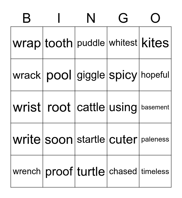 This bingo card has a free space and 24 words: wrench, soon, giggle, chased, kites, wrap, tooth, puddle, using, basement, wrist, pool, cuter, paleness, wrack, proof, turtle, whitest, hopeful, write, root, startle, spicy and timeless.