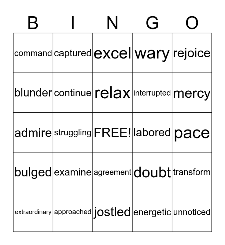 This bingo card has a free space and 24 words: examine, approached, relax, extraordinary, rejoice, command, blunder, captured, labored, agreement, interrupted, admire, doubt, transform, continue, energetic, pace, excel, mercy, struggling, unnoticed, bulged, wary and jostled.