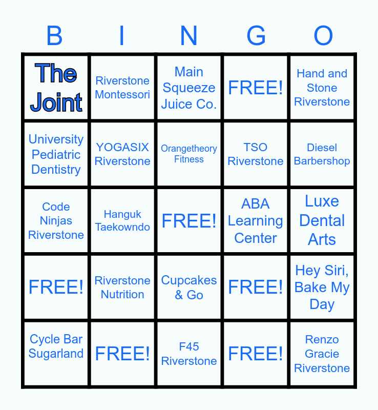 This bingo card has 25 words: Riverstone Nutrition, F45 Riverstone, Orangetheory Fitness, Cycle Bar Sugarland, Hand and Stone Riverstone, The Joint, University Pediatric Dentistry, Riverstone Montessori, ABA Learning Center, Cupcakes & Go, TSO Riverstone, Code Ninjas Riverstone, FREE!, Hey Siri, Bake My Day, YOGASIX Riverstone, Renzo Gracie Riverstone, Luxe Dental Arts, Main Squeeze Juice Co., Diesel Barbershop, Hanguk Taekowndo, FREE!, FREE!, FREE!, FREE! and FREE!.