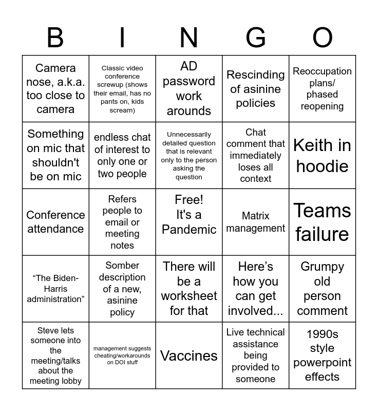 This bingo card has a free space and 63 words: We’re working on it, Permission to come into the office/keeping track of comings/goings, Comment about technical difficulties, Grumpy old person comment, Speaker talks about MP/MF and forgets there are other offices, Steve discusess work with Jane/Keith/etc. as though rest of ESC isn’t there, Classic video conference screwup (shows their email, has no pants on, kids scream), Travel/field work requirements, Unnecessarily detailed question that is relevant only to the person asking the question, The Rubinstein Hat Trick (Max Telework 3x), There will be a worksheet for that, Bad movie/pop culture reference, Teams failure, Reoccupation plans/ phased reopening, Pets on screen, Something on mic that shouldn't be on mic, Refers people to email or meeting notes, Camera nose, a.k.a. too close to camera, All in this together, Chat comment that immediately loses all context, Somber description of a new, asinine policy, “The Biden-Harris administration”, Rescinding of asinine policies, Annoying lobby notice popups, Steve reads a message from Teams in the middle of his sentence, IPDS, Hilarious metaphor/simile, Endless project update, Vaccines, Mutations / Variants, Steve getting depressed, Steve being optimistic, Steve happy, Bad lighting, Keith in hoodie, Steve lets someone into the meeting/talks about the meeting lobby, Unmute or chat, Live technical assistance being provided to someone, BASIS+, endless chat of interest to only one or two people, Conference attendance, Matrix management, “Stay tuned”, USGS Twitter/Instagram account, 1990s style powerpoint effects, management suggests cheating/workarounds on DOI stuff, Svitek/Walter/etc, Here’s how you can get involved..., SC earthquake response = CalTech, Spending deadlines, SSA, Vaccines, “Mac users” hat trick, Interim, Recent security breach, AD password work arounds, International, Summer Interns, Mendenhall, Secretary’s order to undo the last guy, “Recording has started”, Justin and Elizabeth.