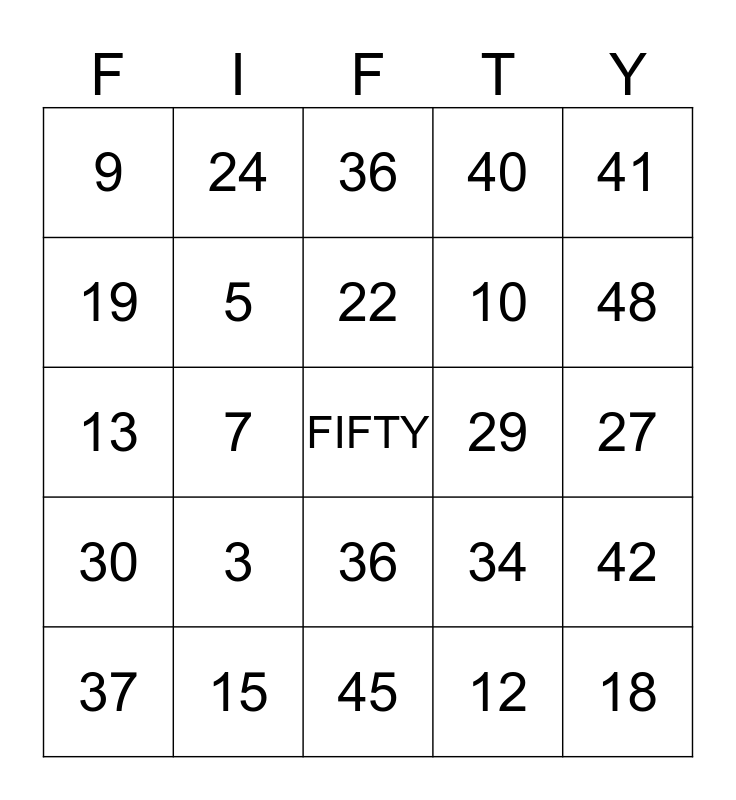 This bingo card has a free space and 24 words: 3, 15, 22, 37, 41, 9, 19, 24, 29, 36, 10, 13, 34, 42, 5, 12, 27, 36, 48, 7, 18, 30, 40 and 45.