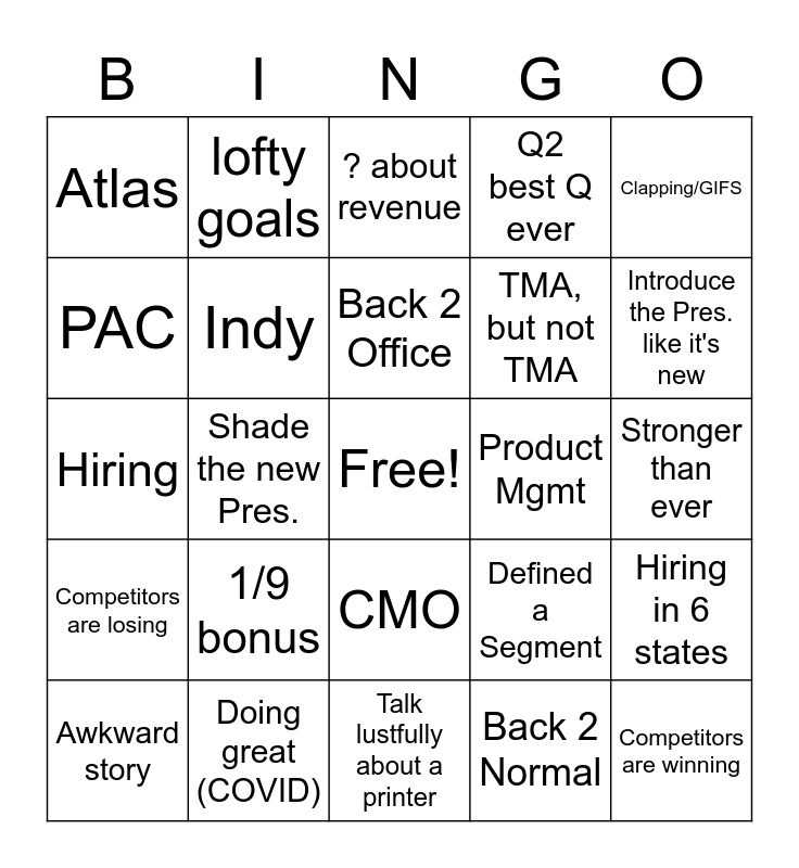 This bingo card has a free space and 24 words: 1/9 bonus, Doing great (COVID), Back 2 Office, Awkward story, Clapping/GIFS, Atlas, PAC, lofty goals, Product Mgmt, CMO, TMA, but not TMA, Hiring, Defined a Segment, Hiring in 6 states, Indy, Back 2 Normal, Stronger than ever, ? about revenue, Introduce the Pres. like it's new, Shade the new Pres., Competitors are winning, Competitors are losing, Q2 best Q ever and Talk lustfully about a printer.