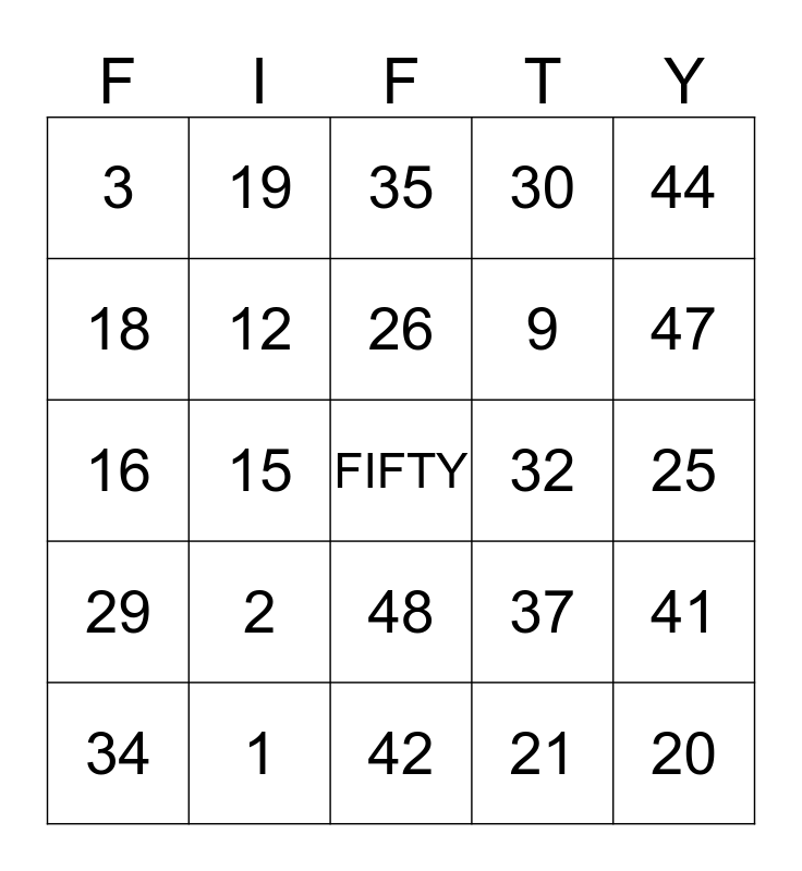 This bingo card has a free space and 24 words: 2, 1, 26, 34, 44, 3, 18, 19, 32, 48, 9, 16, 37, 41, 12, 21, 25, 35, 47, 15, 20, 29, 30 and 42.