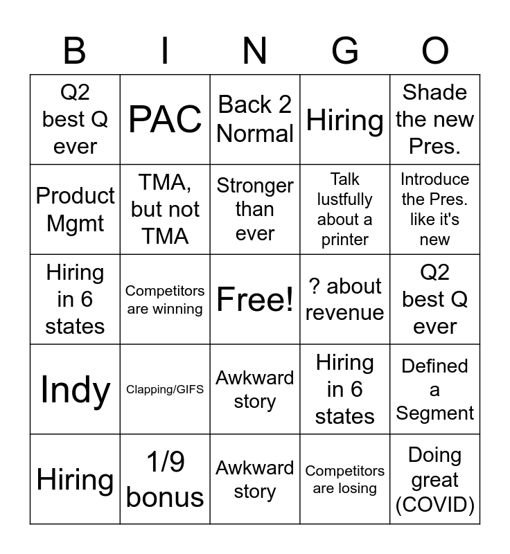 This bingo card has a free space and 48 words: 1/9 bonus, Doing great (COVID), Back 2 Office, Awkward story, Clapping/GIFS, Atlas, PAC, lofty goals, Product Mgmt, CMO, TMA, but not TMA, Hiring, Defined a Segment, Hiring in 6 states, Indy, Back 2 Normal, Stronger than ever, ? about revenue, Introduce the Pres. like it's new, Shade the new Pres., Competitors are winning, Competitors are losing, Q2 best Q ever, Talk lustfully about a printer, lofty goals, Introduce the Pres. like it's new, Hiring, CMO, Awkward story, Indy, Competitors are winning, Defined a Segment, Clapping/GIFS, Atlas, 1/9 bonus, Back 2 Office, ? about revenue, Q2 best Q ever, PAC, Doing great (COVID), Talk lustfully about a printer, Product Mgmt, Back 2 Normal, Competitors are losing, Hiring in 6 states, Stronger than ever, Shade the new Pres. and TMA, but not TMA.