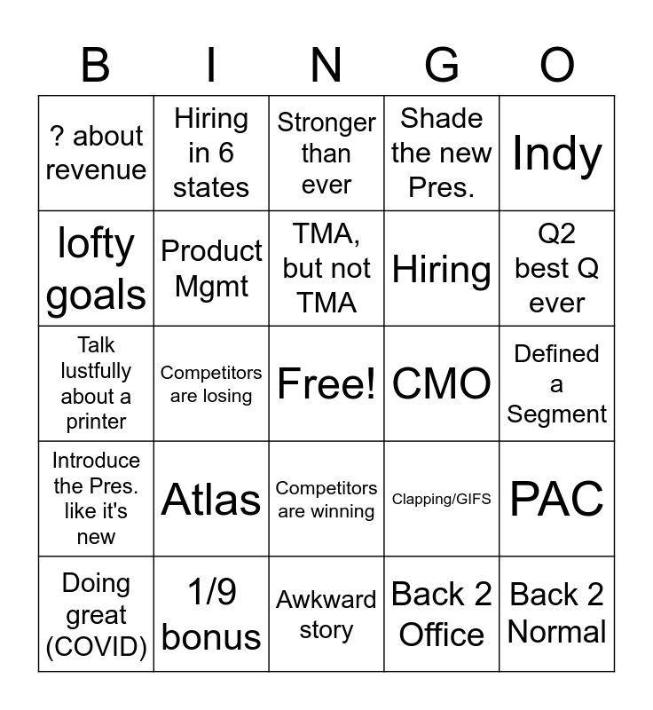 This bingo card has a free space and 24 words: Atlas, 1/9 bonus, TMA, but not TMA, Doing great (COVID), Indy, ? about revenue, lofty goals, Hiring in 6 states, CMO, Competitors are winning, Hiring, Talk lustfully about a printer, Clapping/GIFS, PAC, Product Mgmt, Back 2 Office, Defined a Segment, Stronger than ever, Q2 best Q ever, Competitors are losing, Back 2 Normal, Introduce the Pres. like it's new, Shade the new Pres. and Awkward story.
