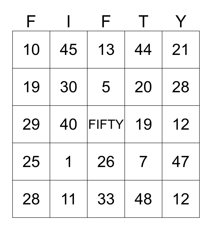 This bingo card has a free space and 24 words: 1, 11, 5, 28, 21, 10, 19, 45, 19, 26, 20, 29, 7, 47, 30, 48, 12, 13, 28, 40, 12, 25, 44 and 33.