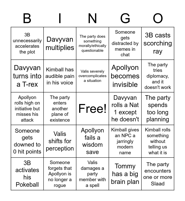 This bingo card has a free space and 25 words: Valis shifts for perception, Valis damages a party member with a spell, Valis severely overcomplicates a situation, 3B activates his Pokeball, 3B casts scorching ray, 3B unnecessarily accelerates the plot, Davyvan turns into a T-rex, Davyvan multiplies, Davyvan rolls a Nat 1 except he doesn't, Apollyon fails a wisdom save, Apollyon becomes invisible, Apollyon rolls high on initiative but misses his attack, Kimball gives an NPC a jarringly modern name, Kimball rolls something without telling us what it is, Kimball has audible pain in his voice, The party gets imprisoned, The party spends too long planning, The party does something morally/ethically questionable, The party tries diplomacy, and it doesn't work, The party enters another plane of existence, The party encounters one or more Slaad, Someone forgets that Apollyon is no longer a rogue, Someone gets downed to 0 hit points, Someone gets distracted by memes in chat and Tommy has a big brain plan.