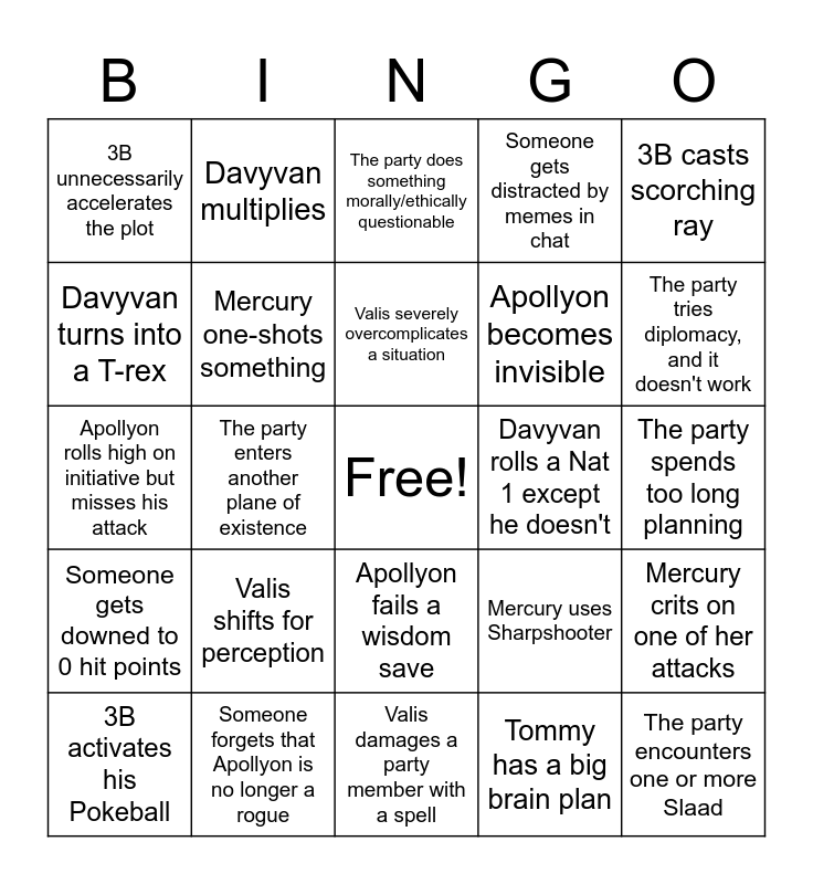 This bingo card has a free space and 25 words: Valis shifts for perception, Valis damages a party member with a spell, Valis severely overcomplicates a situation, 3B activates his Pokeball, 3B casts scorching ray, 3B unnecessarily accelerates the plot, Davyvan turns into a T-rex, Davyvan multiplies, Davyvan rolls a Nat 1 except he doesn't, Apollyon fails a wisdom save, Apollyon becomes invisible, Apollyon rolls high on initiative but misses his attack, Mercury uses Sharpshooter, Mercury crits on one of her attacks, Mercury one-shots something, The party gets imprisoned, The party spends too long planning, The party does something morally/ethically questionable, The party tries diplomacy, and it doesn't work, The party enters another plane of existence, The party encounters one or more Slaad, Someone forgets that Apollyon is no longer a rogue, Someone gets downed to 0 hit points, Someone gets distracted by memes in chat and Tommy has a big brain plan.