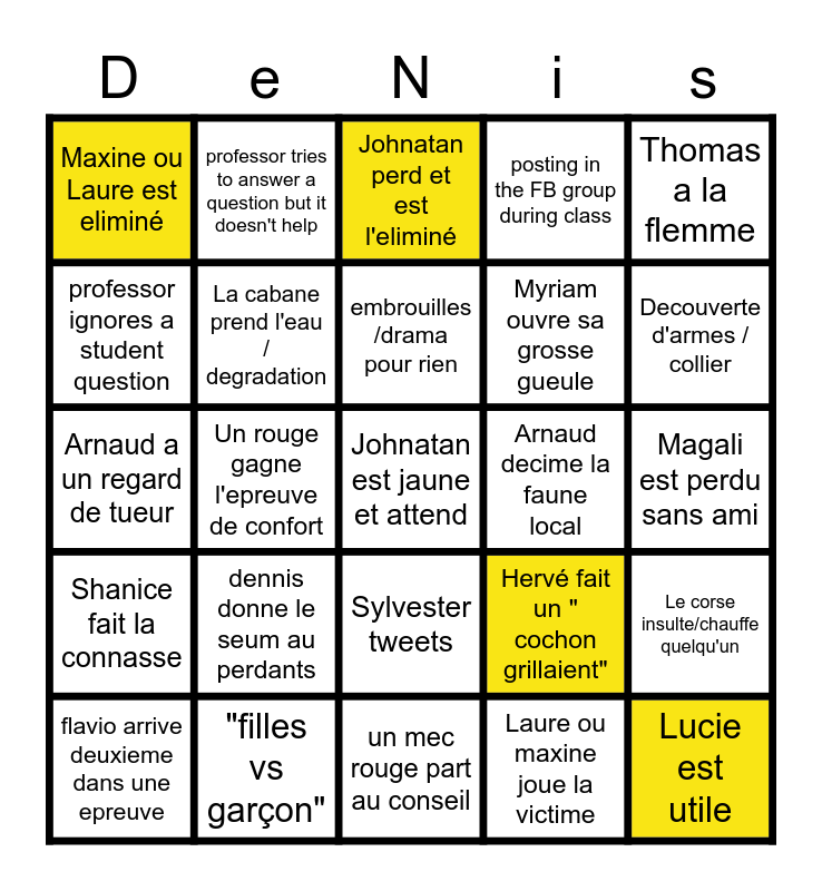 This bingo card has a free space and 29 words: Vincent pose /marche de gayzou, "filles vs garçon", Johnatan perd et est l'eliminé, HYPOCRISIE TOTALe, Thomas a la flemme, Maxine ou Laure est eliminé, La cabane prend l'eau / degradation, embrouilles /drama pour rien, Arnaud decime la faune local, Le corse insulte/chauffe quelqu'un, flavio arrive deuxieme dans une epreuve, Un rouge gagne l'epreuve de confort, Laure ou maxine joue la victime, Lucie est utile, Arnaud a un regard de tueur, Laeticia parle moins de 3 fois de l'episode, un mec rouge part au conseil, Hervé fait un " cochon grillaient", Decouverte d'armes / collier, Shanice fait la connasse, dennis donne le seum au perdants, Armes secretes/collier au conseil, Myriam ouvre sa grosse gueule, Magali est perdu sans ami, professor ignores a student question, professor tries to answer a question but it doesn't help, Sylvester tweets, posting in the FB group during class and PG gives us more than 4 pieces of homework.