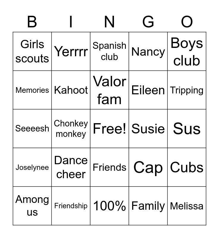 This bingo card has a free space and 26 words: Friends, Family, Valor fam, Friendship, Boys club, Girls scouts, Memories, Yerrrr, Sus, Cap, Eileen, Seeeesh, Cubs, Among us, Chonkey monkey, My guyyyy, Nancy, Joselynee, Spanish club, Melissa, Tripping, 100%, Susie, Dance cheer, Kahoot and Welcome to chili’s.