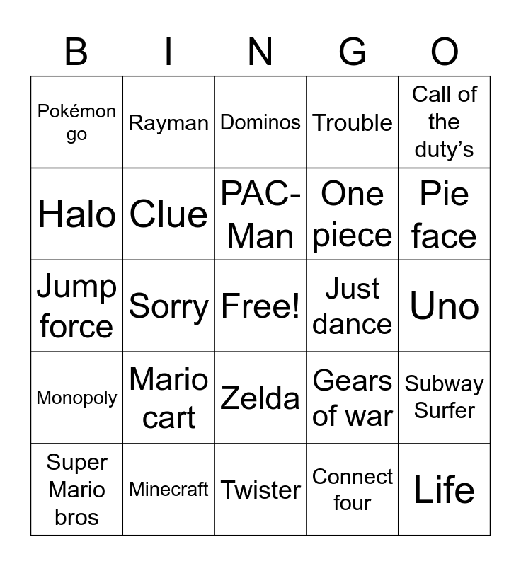 This bingo card has a free space and 24 words: Mario cart, Minecraft, PAC-Man, Super Mario bros, Call of the duty’s, Pokémon go, Halo, Rayman, Just dance, Zelda, One piece, Jump force, Gears of war, Subway Surfer, Clue, Connect four, Uno, Dominos, Pie face, Sorry, Life, Monopoly, Trouble and Twister.