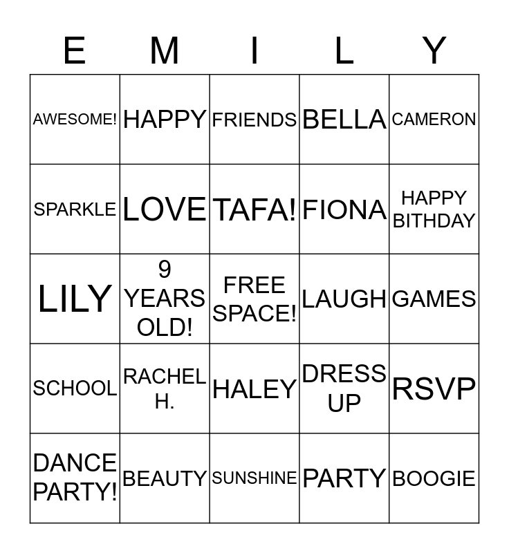 This bingo card has a free space and 24 words: RACHEL H., BEAUTY, TAFA!, DANCE PARTY!, CAMERON, AWESOME!, SPARKLE, HAPPY, LAUGH, HALEY, FIONA, LILY, DRESS UP, RSVP, LOVE, PARTY, GAMES, FRIENDS, HAPPY BITHDAY, 9 YEARS OLD!, BOOGIE, SCHOOL, BELLA and SUNSHINE.