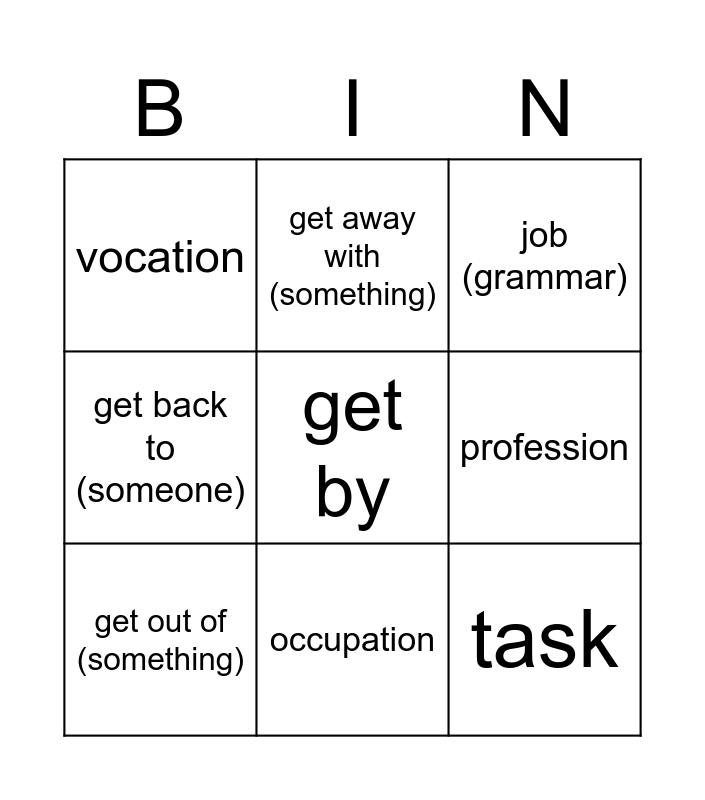 This bingo card has 14 words: gotten around to (something), get over (something), get out of (something), get away with (something), get back to (someone), get by, task, job (meaning), occupation, vocation, trade, profession, job (grammar) and work.