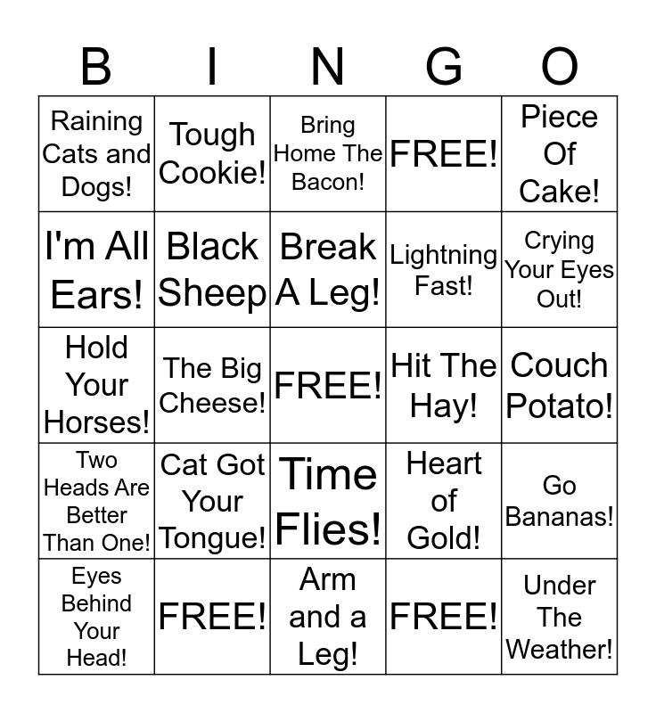 This bingo card has a free space and 24 words: Cat Got Your Tongue!, FREE!, Break A Leg!, Eyes Behind Your Head!, Piece Of Cake!, Raining Cats and Dogs!, I'm All Ears!, Tough Cookie!, Hit The Hay!, Time Flies!, Lightning Fast!, Hold Your Horses!, Heart of Gold!, Go Bananas!, Black Sheep, FREE!, Couch Potato!, Bring Home The Bacon!, Crying Your Eyes Out!, The Big Cheese!, Under The Weather!, Two Heads Are Better Than One!, FREE! and Arm and a Leg!.