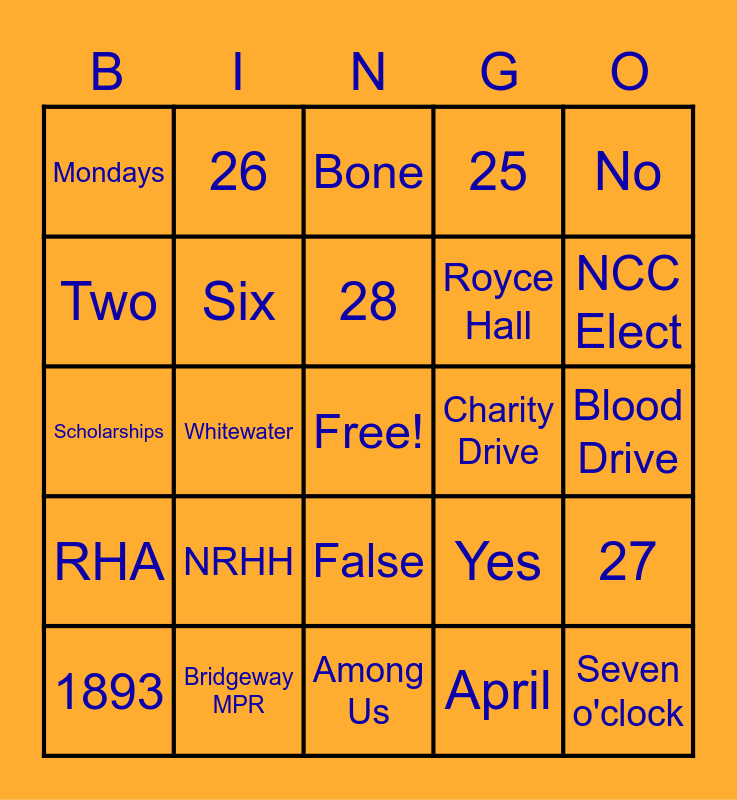 This bingo card has a free space and 29 words: 1893, Chicago, Whitewater, Ceramic, Mondays, Bone, Six, NRHH, Charity Drive, Bridgeway MPR, Blood Drive, Seven o'clock, Among Us, April, NCC Elect, 280, False, RHA, No, Scholarships, Yes, Gabby Carley, Royce Hall, Two, 25, 26, 27, 28 and 29.