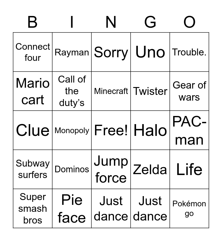 This bingo card has a free space and 24 words: Dominos, Pie face, Minecraft, Super smash bros, Trouble., Connect four, Mario cart, Rayman, Halo, Jump force, Twister, Clue, Zelda, Life, Call of the duty’s, Just dance, PAC-man, Sorry, Gear of wars, Monopoly, Pokémon go, Subway surfers, Uno and Just dance.