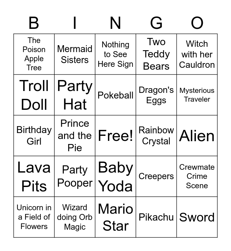 This bingo card has a free space and 26 words: Baby Yoda, Pikachu, Pokeball, Wizard doing Orb Magic, Witch with her Cauldron, The Poison Apple Tree, Troll Doll, Mermaid Sisters, Alien, Creepers, Dragon's Eggs, Birthday Girl, Crewmate Crime Scene, Unicorn in a Field of Flowers, Prince and the Pie, Piñata, Two Teddy Bears, Lava Pits, Nothing to See Here Sign, Sword, Mysterious Traveler, Mario Star, Rainbow Crystal, Party Pooper, Party Hat and Birthday Gift.