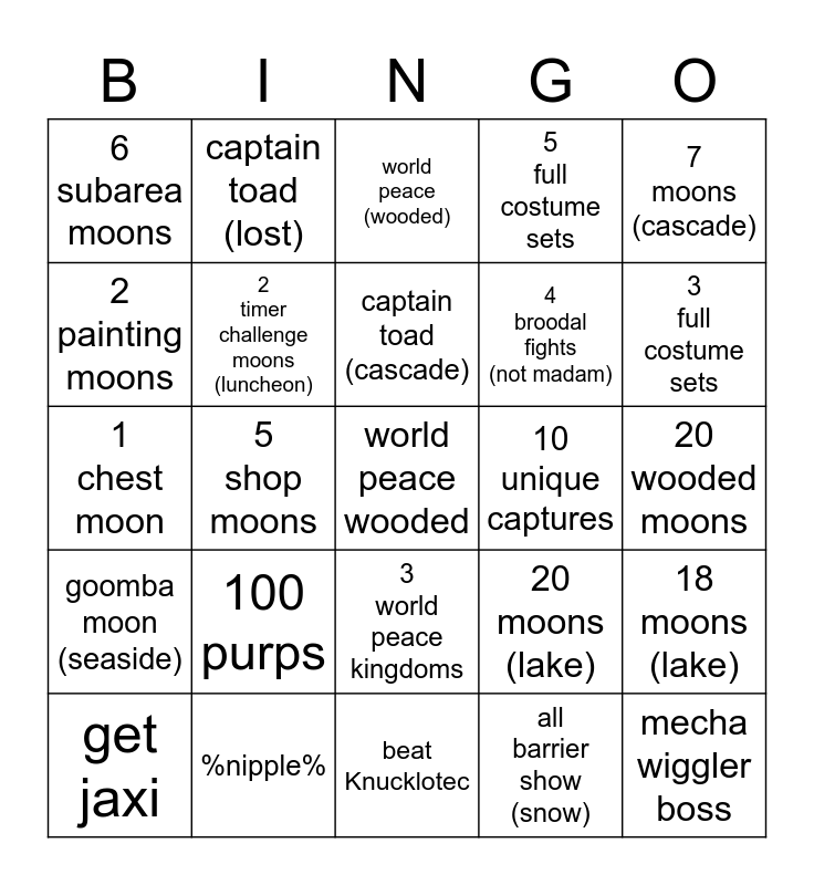 This bingo card has 25 words: 100 purps, beat Knucklotec, captain toad (cascade), get jaxi, 7 moons (cascade), 6 subarea moons, 2 painting moons, captain toad (lost), 10 unique captures, 3 world peace kingdoms, 4 broodal fights (not madam), 1 chest moon, 20 moons (lake), 18 moons (lake), 2 timer challenge moons (luncheon), mecha wiggler boss, 20 wooded moons, world peace (wooded), 3 full costume sets, 5 shop moons, world peace wooded, %nipple%, goomba moon (seaside), 5 full costume sets and all barrier show (snow).