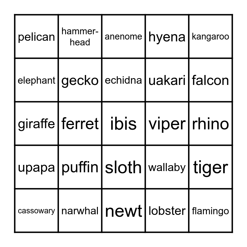 This bingo card has 74 words: aardvark, aligator, anenome, baboon, butterfly, barnacle, camel, capybara, cassowary, dragonfly, dolphin, dodo-bird, echidna, elephant, elk, ferret, flamingo, falcon, gazelle, giraffe, gecko, hammer-head, hyena, hippo, ibis, irukandji, impala, jabiru, jaguar, jerboa, kangaroo, komodo, koi, leather-back, leopard, lobster, manatee, meerkat, millipede, numbat, newt, narwhal, ocelot, ostrich, orca, pelican, platypus, puffin, quokka, quoll, quail, reindeer, rhino, road-runner, sea-cucumber, seahorse, sloth, turkey, tucan, tiger, uakari, ulysses, upapa, vampire-bat, viper, vicuna, wildebeest, wombat, wallaby, xantus, yak, zebra, zebu and zorilla.