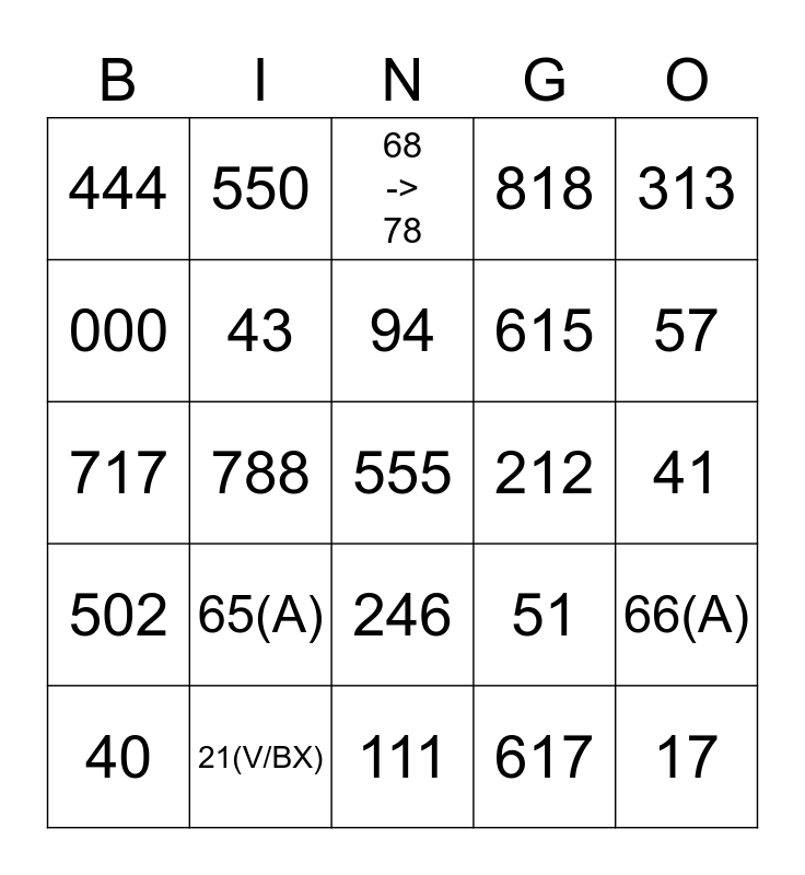 This bingo card has 25 words: 65(A), 111, 94, 40, 313, 444, 000, 550, 212, 246, 615, 717, 51, 66(A), 43, 17, 41, 68 -> 78, 57, 788, 555, 21(V/BX), 502, 818 and 617.