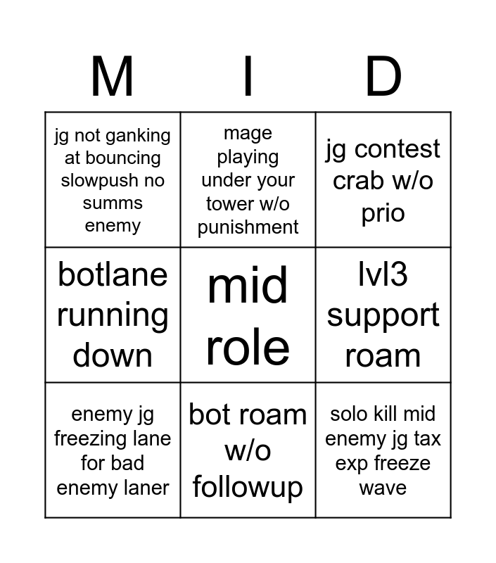 This bingo card has a free space and 8 words: lvl3 support roam, jg contest crab w/o prio, mage playing under your tower w/o punishment, enemy jg freezing lane for bad enemy laner, jg not ganking at bouncing slowpush no summs enemy, solo kill mid enemy jg tax exp freeze wave, botlane running down and bot roam w/o followup.