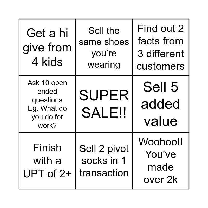 This bingo card has a free space and 8 words: Sell 5 added value, Find out 2 facts from 3 different customers, Sell the same shoes you’re wearing, Finish with a UPT of 2+, Get a hi give from 4 kids, Woohoo!! You’ve made over 2k, Ask 10 open ended questions Eg. What do you do for work? and Sell 2 pivot socks in 1 transaction.