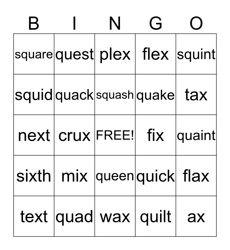 This bingo card has a free space and 26 words: queen, quilt, squash, quad, squint, square, squid, quest, quaint, quick, quake, next, flax, text, crux, flax, flex, sixth, plex, ax, tax, wax, fix, mix, quack and quote.
