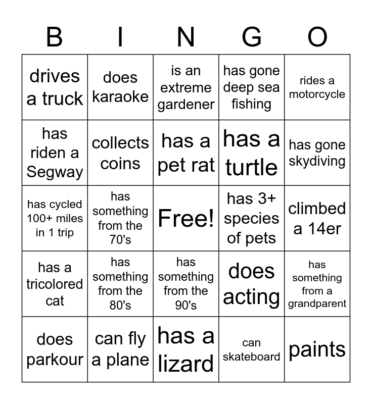 This bingo card has a free space and 29 words: does parkour, crotchets, has something from the 70's, has a dog named Buddy, drives a truck, is an extreme gardener, collects coins, has something from the 80's, has 3+ species of pets, can fly a plane, climbed a 14er, paints, has a lizard, can skateboard, has gone skydiving, fly fishes, has something from the 90's, has a tricolored cat, rides a motorcycle, has cycled 100+ miles in 1 trip, does acting, has something from the 60's, has a turtle, has riden a Segway, has gone deep sea fishing, does karaoke, has something from a grandparent, has a pet rat and rollerskates.