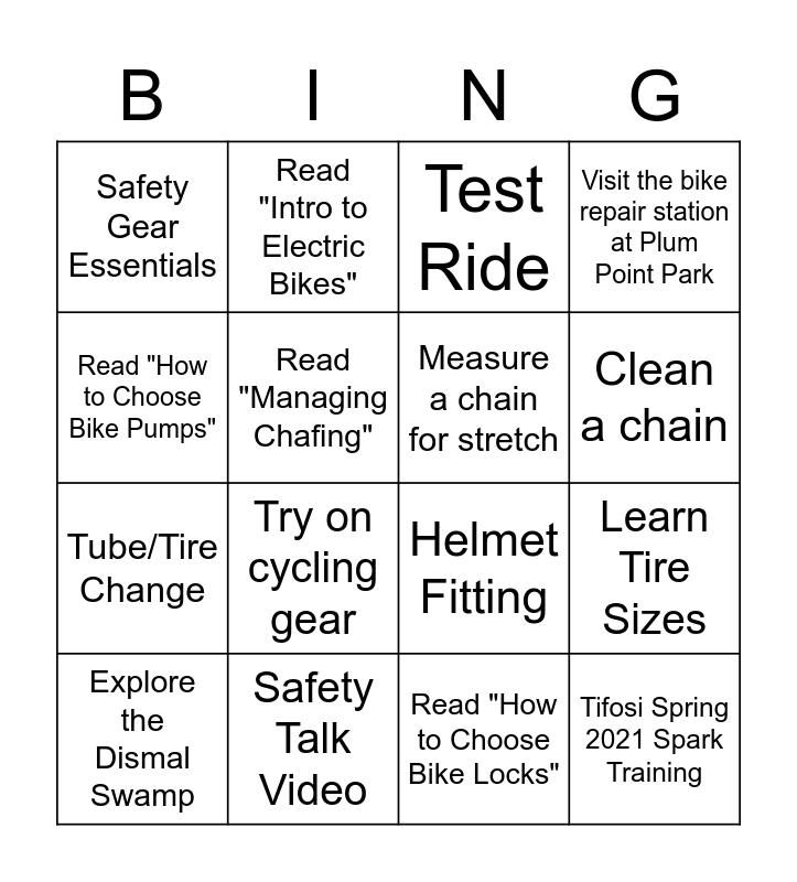 This bingo card has 16 words: Safety Talk Video, Learn Tire Sizes, Test Ride, Safety Gear Essentials, Tube/Tire Change, Read "Intro to Electric Bikes", Helmet Fitting, Read "How to Choose Bike Locks", Read "How to Choose Bike Pumps", Read "Managing Chafing", Explore the Dismal Swamp, Visit the bike repair station at Plum Point Park, Try on cycling gear, Clean a chain, Measure a chain for stretch and Tifosi Spring 2021 Spark Training.