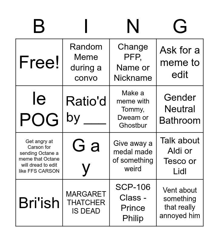 This bingo card has 16 words: Bri'ish, MARGARET THATCHER IS DEAD, Change PFP, Name or Nickname, Ask for a meme to edit, le POG, Random Meme during a convo, Give away a medal made of something weird, Talk about Aldi or Tesco or Lidl, Free!, Ratio'd by ___, SCP-106 Class - Prince Philip, Gender Neutral Bathroom, Get angry at Carson for sending Octane a meme that Octane will dread to edit like FFS CARSON, G a y, Make a meme with Tommy, Dweam or Ghostbur and Vent about something that really annoyed him.