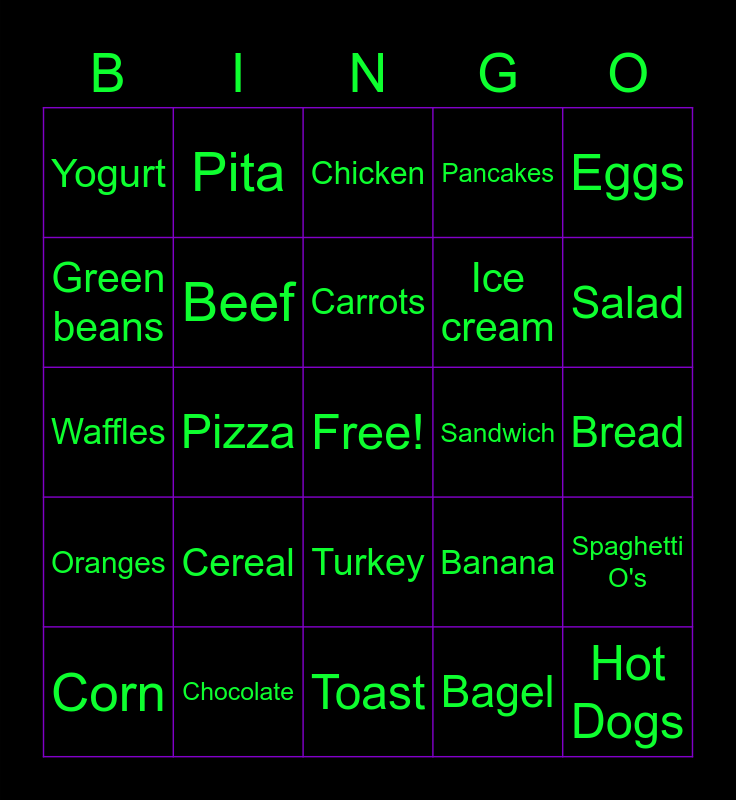 This bingo card has a free space and 30 words: Chocolate, Mac n Cheese, Pizza, Pasta, Yogurt, Chicken, Beef, Turkey, Sandwich, Toast, Bread, Hot Dogs, Bagel, Strudel, Salad, Apple, Banana, Oranges, Cereal, Eggs, Waffles, Rice, Pita, Ice cream, Green beans, Pancakes, Spaghetti O's, Corn, Carrots and Cherries.