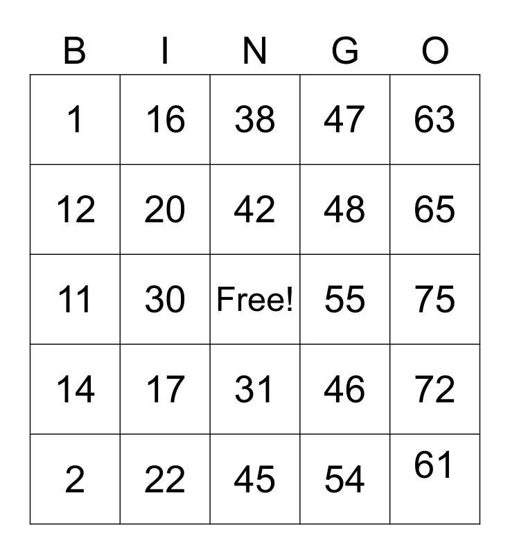 This bingo card has a free space and 24 words: 2, 17, 42, 54, 63, 1, 16, 38, 55, 75, 11, 20, 46, 72, 12, 22, 45, 47, 65, 14, 30, 31, 48 and 61.