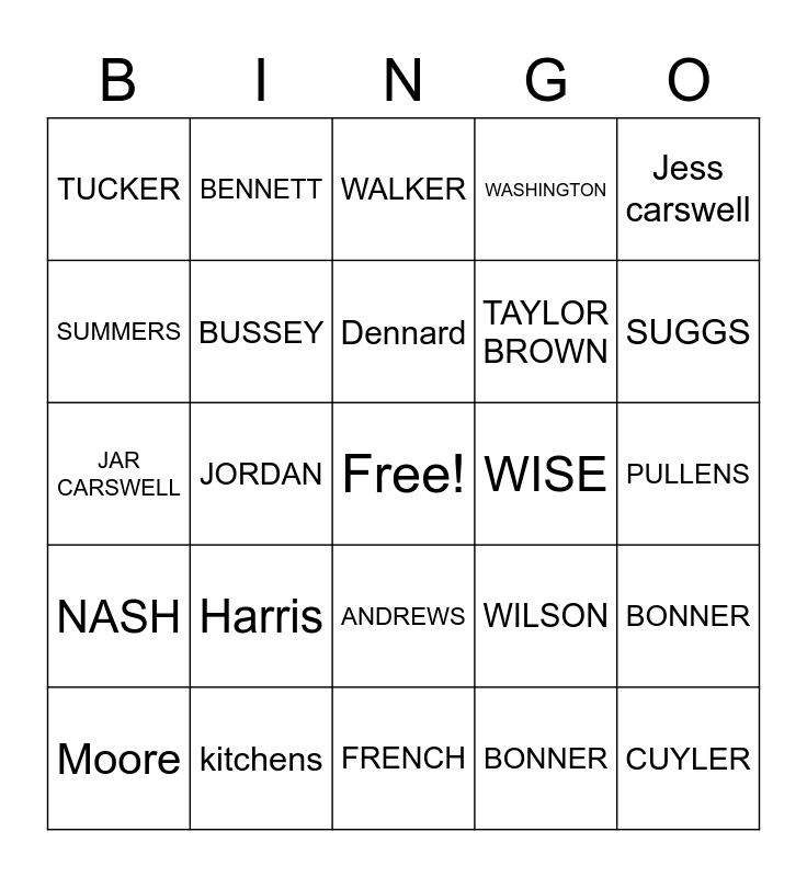 This bingo card has a free space and 24 words: Harris, kitchens, Dennard, Moore, Jess carswell, TUCKER, SUMMERS, BENNETT, WISE, ANDREWS, TAYLOR BROWN, JAR CARSWELL, WILSON, BONNER, BUSSEY, BONNER, PULLENS, WALKER, SUGGS, JORDAN, CUYLER, NASH, WASHINGTON and FRENCH.