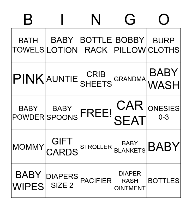 This bingo card has a free space and 43 words: DIAPERS NEWBORN, BOTTLES, DIAPER PAIL, BABY WIPES, PAIGE, DIAPER RASH OINTMENT, BOTTLE RACK, BIBS, BURP CLOTHS, DIAPERS SIZE 2, BOBBY PILLOW, CAR SEAT, STROLLER, GIFT CARDS, MONEY, PACIFIER, BABY BATH TUB, BABY POWDER, JORDON, BABY WASH, BABY LOTION, JULIANA, FAMILY, BATH TOWELS, NEWBORN SOCKS, ONESIES 0-3, ONESIES 6-9, ONESIES 3-6, BABY BLANKETS, MOMMY, DADDY, BABY, BABY BOTTLE BRUSH, BABY SPOONS, BABY BOWLS, NURSING PADS, TEETHER, CRIB SHEETS, PINK, GRANDMA, GRANDPA, AUNTIE and UNCLE.