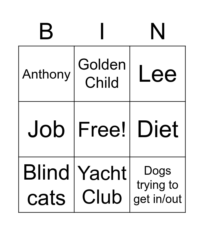 This bingo card has a free space and 41 words: Ting, Natalie, Chickens, Blind cats, Tony, Saltings, Yacht Club, Razor Blades & Toilet Roll, Dogs trying to get in/out, Covid, Brexit, Job, Theo, George, Darts, Guinness, Car Crash, Anthony, Weather, Lee, My Boys, Neville, Extension, Conservatory, Pat, Grandad, Nanna, David, Wescott, Frank, George, Golden Child, Jean Beach, Eveline, Nahuel, Diet, Weight loss, Jogging, Diabetes, Going for a walk and Dissappearing bacon.