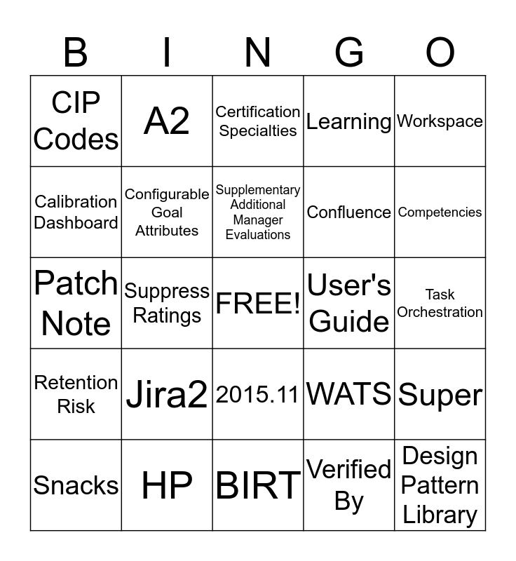 This bingo card has a free space and 24 words: Jira2, HP, Supplementary Additional Manager Evaluations, Snacks, Workspace, CIP Codes, Calibration Dashboard, A2, User's Guide, 2015.11, Confluence, Patch Note, WATS, Super, Configurable Goal Attributes, Verified By, Task Orchestration, Certification Specialties, Competencies, Suppress Ratings, Design Pattern Library, Retention Risk, Learning and BIRT.