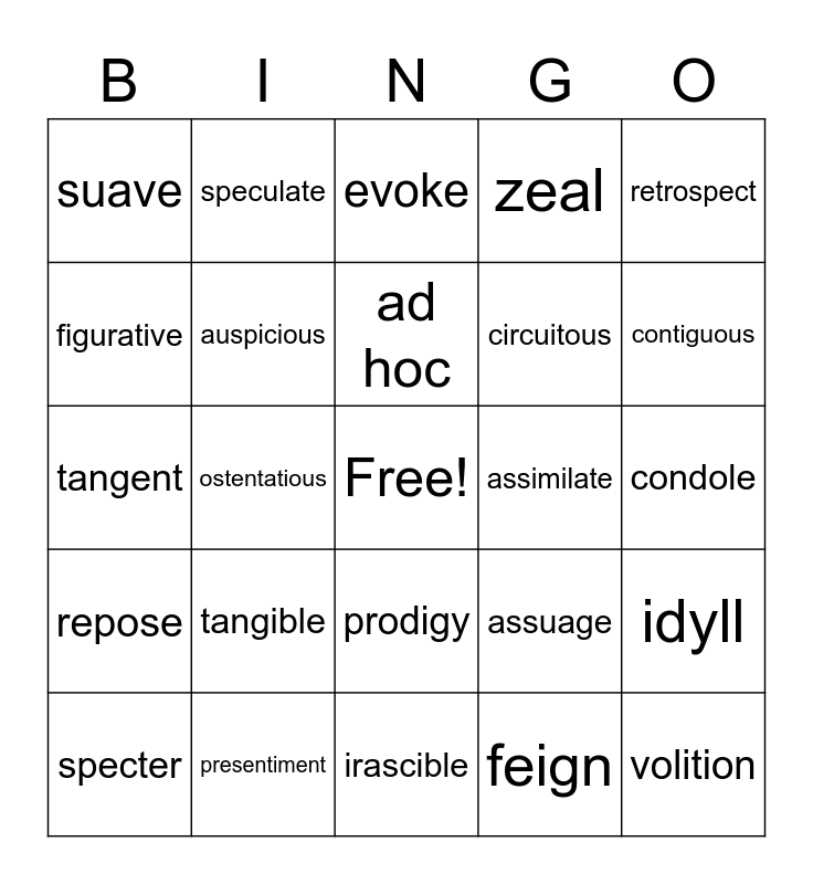 This bingo card has a free space and 33 words: improvise, ostensible, ostentatious, reiterate, repose, auspicious, retrospect, specter, speculate, vigil, ad hoc, evoke, redolent, resonate, assimilate, contiguous, presentiment, tangent, tangible, assuage, prodigy, profane, suave, condole, irascible, volition, zeal, circuitous, figurative, idyll, rote, feign and concave.