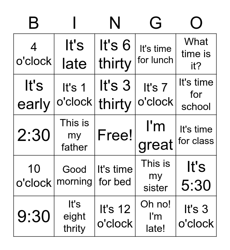 This bingo card has a free space and 24 words: Good morning, It's eight thrity, It's 3 thirty, 9:30, What time is it?, 4 o'clock, It's early, It's late, I'm great, It's time for bed, It's 7 o'clock, 2:30, This is my sister, It's 5:30, It's 1 o'clock, Oh no! I'm late!, It's time for class, It's 6 thirty, It's time for school, This is my father, It's 3 o'clock, 10 o'clock, It's time for lunch and It's 12 o'clock.