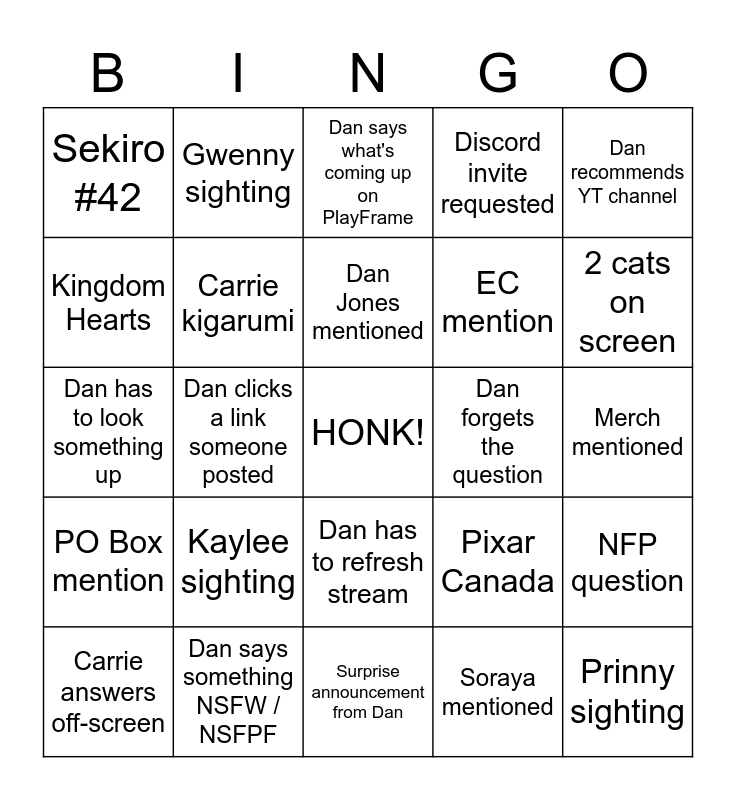 This bingo card has a free space and 24 words: Kaylee sighting, Dan says something NSFW / NSFPF, Dan Jones mentioned, Carrie answers off-screen, Dan recommends YT channel, Sekiro #42, Kingdom Hearts, Gwenny sighting, Dan forgets the question, Dan has to refresh stream, EC mention, Dan has to look something up, Pixar Canada, NFP question, Carrie kigarumi, Soraya mentioned, Merch mentioned, Dan says what's coming up on PlayFrame, 2 cats on screen, Dan clicks a link someone posted, Prinny sighting, PO Box mention, Discord invite requested and Surprise announcement from Dan.