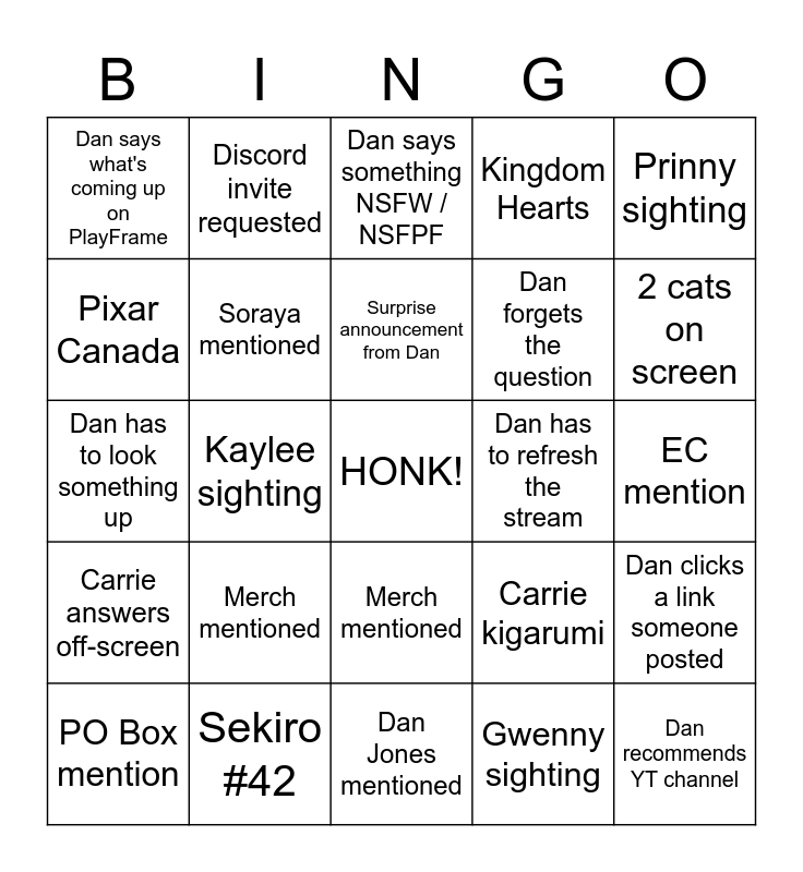 This bingo card has a free space and 24 words: Merch mentioned, Sekiro #42, Surprise announcement from Dan, PO Box mention, Prinny sighting, Dan says what's coming up on PlayFrame, Pixar Canada, Discord invite requested, Dan has to refresh the stream, Merch mentioned, Dan forgets the question, Dan has to look something up, Carrie kigarumi, Dan clicks a link someone posted, Soraya mentioned, Gwenny sighting, EC mention, Dan says something NSFW / NSFPF, 2 cats on screen, Kaylee sighting, Dan recommends YT channel, Carrie answers off-screen, Kingdom Hearts and Dan Jones mentioned.