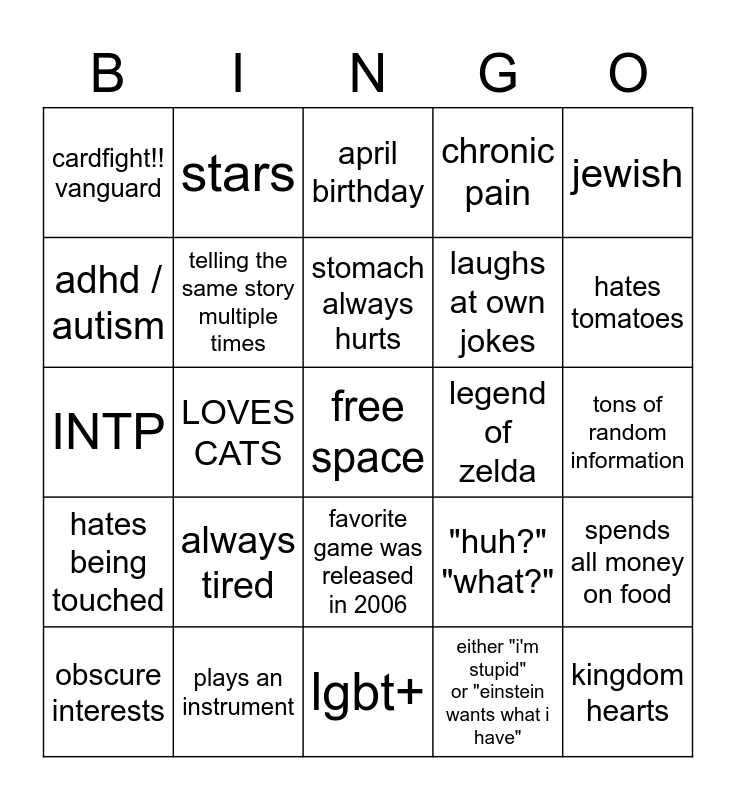 This bingo card has a free space and 24 words: always tired, plays an instrument, stomach always hurts, obscure interests, jewish, cardfight!! vanguard, adhd / autism, stars, legend of zelda, favorite game was released in 2006, laughs at own jokes, INTP, "huh?" "what?", spends all money on food, telling the same story multiple times, either "i'm stupid" or "einstein wants what i have", tons of random information, april birthday, hates tomatoes, LOVES CATS, kingdom hearts, hates being touched, chronic pain and lgbt+.