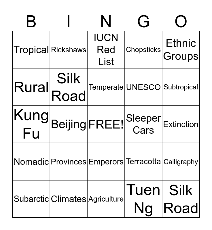 This bingo card has a free space and 24 words: Provinces, Climates, Temperate, Subarctic, Ethnic Groups, Tropical, Rural, Rickshaws, Sleeper Cars, Emperors, UNESCO, Kung Fu, Terracotta, Calligraphy, Silk Road, Tuen Ng, Extinction, IUCN Red List, Subtropical, Beijing, Silk Road, Nomadic, Chopsticks and Agriculture.