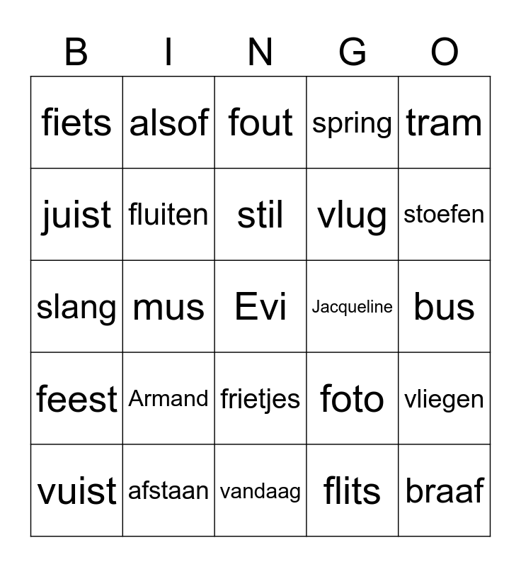 This bingo card has a free space and 24 words: Armand, afstaan, stil, vuist, tram, fiets, juist, alsof, Jacqueline, frietjes, vlug, slang, foto, vliegen, fluiten, flits, bus, fout, stoefen, mus, braaf, feest, spring and vandaag.