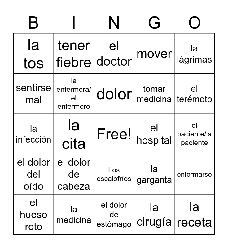 This bingo card has a free space and 29 words: el hueso roto, la ambulancia, la cita, la clínica, la tos, el doctor, la enfermera/ el enfermero, el dolor de cabeza, el hospital, la medicina, el paciente/la paciente, la receta, el dolor de estómago, la cirugía, el terémoto, Me duele la cabeza., Los escalofríos, el dolor del oído, la lágrimas, la infección, la garganta, vomitar, tomar medicina, sentirse mal, mover, tener fiebre, enfermarse, dolor and Necesito una cita..