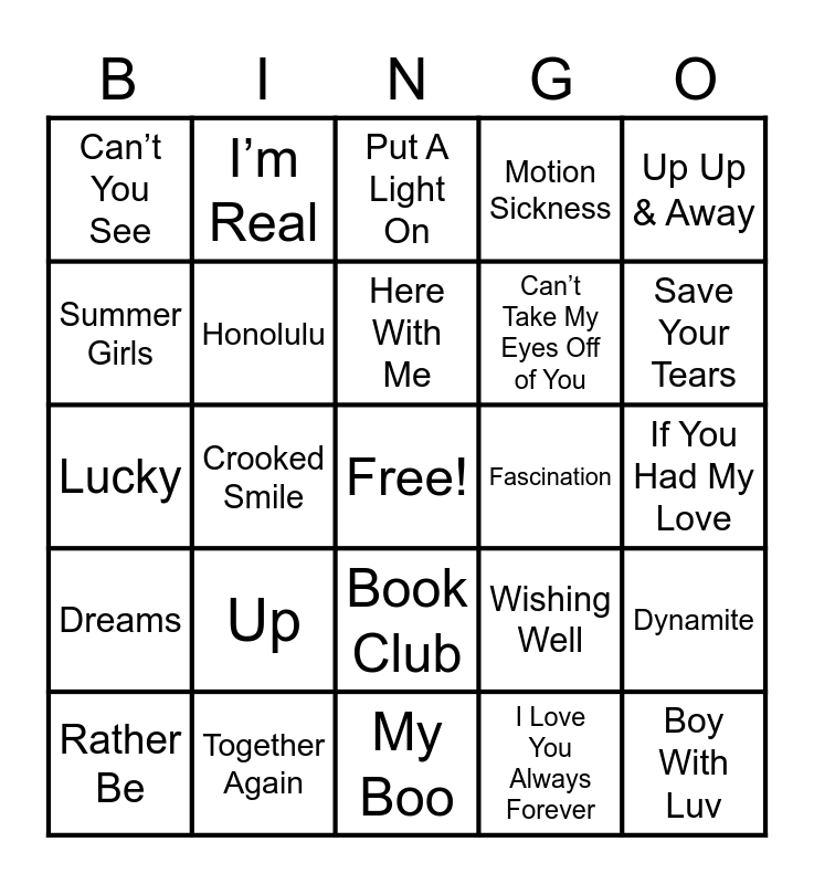 This bingo card has a free space and 145 words: Heat Waves-, Savage -, Best friend-, Dua Lipa, C’est La Vie, Wishing Well, Montero -, Sugar We’re Going Down, Electric Feel, Everywhere, Tusk, Dancing Queen, Dancing in the Dark, Twist and Shout, California Dreamin, Stop! In the Name of Love, I Wanna Dance with Somebody, It’s Not Right But it’s Okay, Big Ol Freak, Dang!, Desperado, Dynamite, Beauty and a Beat, Get Free, Ain’t It Fun, Crooked Smile, I’m Real, Independent Woman, Pass That Dutch, Whenever Wherever, Pop, Get the Party Started, Get Right, If You Had My Love, Ride Wit Me, Say My Name, Forever, All We Got, Can’t Take My Eyes Off of You, Flowers in Your Hair, King and Lionheart, Island in the Sun, Book Club, Come Down, The Weekend, Girl, Steal My Sunshine, What If I Go?, Pink + White, Wake Up, Never Be Like You, Marinade, Rather Be, Novacane, Humble, Anemone, Florida, Coffee, Give It Up, Gold, Put A Light On, Anna Sun, Hold On, The Wire, Cameras, Fascination, Dreams, The Boys of Summer, Living Darfur, Delicate, Need You, Buttercup, Can’t You See, Hunnybee, Girls Just Wanna Have Some, Miss You, Surfin, Innerbloom, Hold Up, Motion Sickness, Dark Blue, Cupid’s Chokehold, Jasey Rae (acoustic), White Iverson, StarShips, We R Who We R, Just a Girl, Fantasy, Juicy, My Boo, Hey Jealousy, We Like to Party!, Praise You, Hip Hop Hooray, Together Again, Say You’ll Be There, (You Drive Me) Crazy, As Long as You Love Me, Lucky, What a Girl Wants, Truly Madly Deeply, Summer Girls, Crash Into Me, Semi-Charmed Life, Can I Kick It?, Here With Me, Basket Case, One Week, The Anthem, Ultimate, 3 Small Words, Up, Peaches, Save Your Tears, Golden, Boy With Luv, Up Up & Away, Bring It All Back, Dancing On My Own, You Belong With Me, Hold On, Therefore I Am, Kids, Shuffle, I Love You Always Forever, Lose Control, The Rhythm of the Night, Bonfire, EARFQUAKE, -bad guy, Purple Hat, Juice, The Importance of Being idle, Pineapple Skies, Oh Cecilia, Little Garcon, Petals, Loner, Think About Things, Beggin’, Honolulu, Believe, It’s All Coming Back to Me Now, Hey and Alfie.